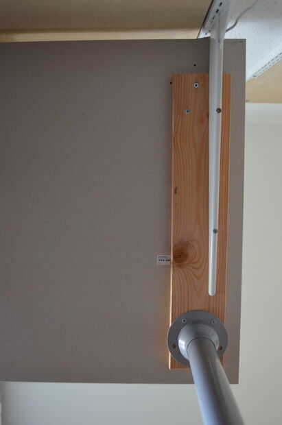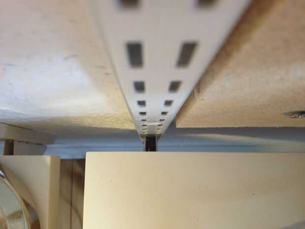Solución: Atornille una pieza de madera (2 cm x 9,5 cm x ~ 54 cm) debajo de la mesa (donde los orificios son!).