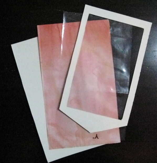 -, Apilados el cartón, el fondo y la bolsa de sándwich en el orden mostrado en la imagen. Cortar el papel sandwich, el fondo y la otra pieza de cartón también en la misma forma de contorno como el marco. -Después de todo las piezas han sido cortadas y alineadas, les grapadas.