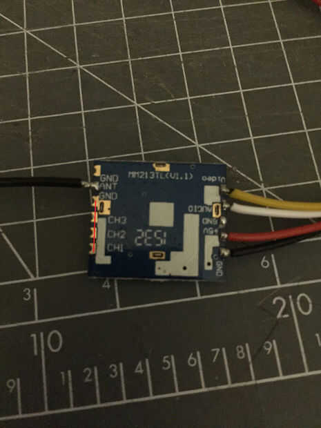Esta discusión, explica lo que debe hacer para cambiar la frecuencia de bandas en el módulo MM213TL V1.1, en mi caso hice la gota de soldadura en las patillas 3 y 4 (a tierra) para conmutación en banda A, y yo he soldado las almohadillas "CH2 CH1, CH2," a la tierra. (Pero para Fatshark, también funciona con otras configuraciones de canal).