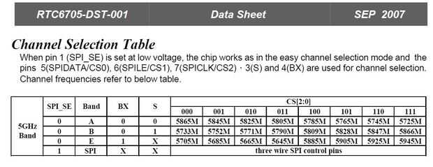 La hoja de datos de la viruta del RTC6705 está aquí (véase tabla de selección de canal pàg.7): https://www.google.it/url?sa=t&rct=j&q=&esrc=s&so...