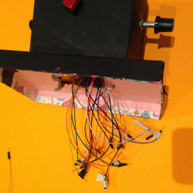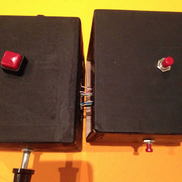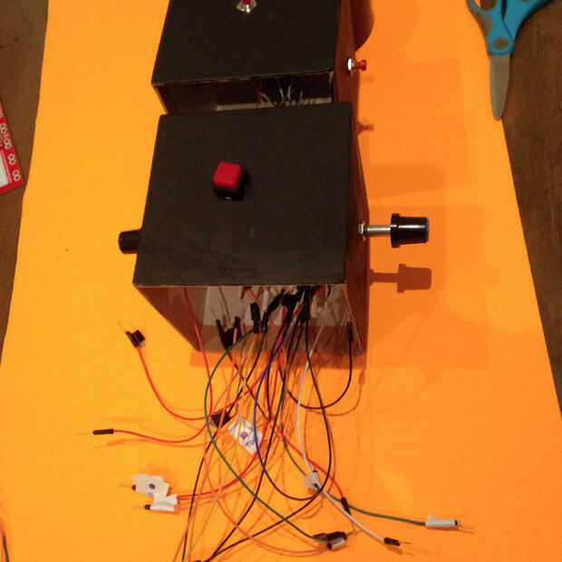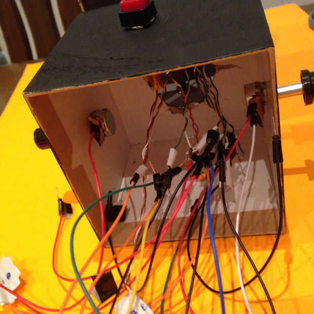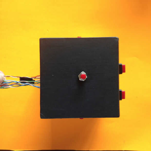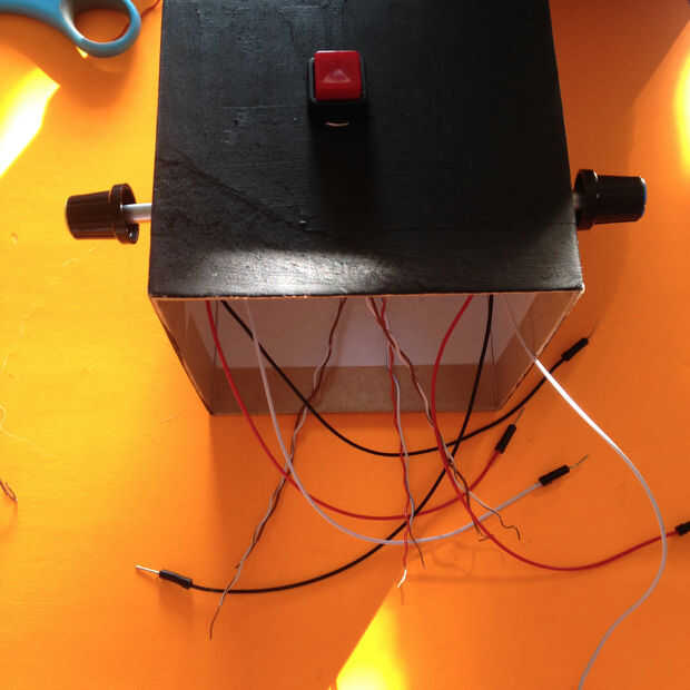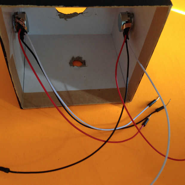 Ahora, se repetirá este paso con los 2 botones + 2 Potentiometres en el cuadro central . Una vez que hayas colocado tus 2 potentiometres dentro de la caja, ahora podrás poner tus botones dentro de la esfera giratoria!