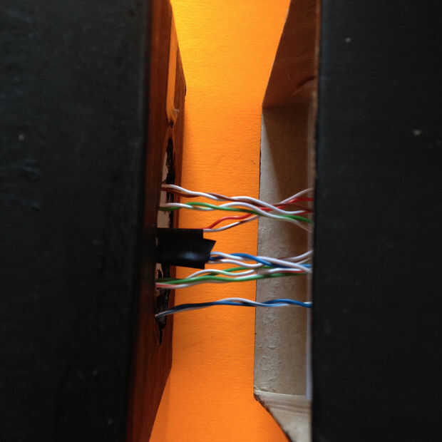 Una vez hecho esto, puede tomar el colectivo cableado de la caja superior en un montón y cuidadosamente los hilos a través del agujero grande encima de la caja media.
