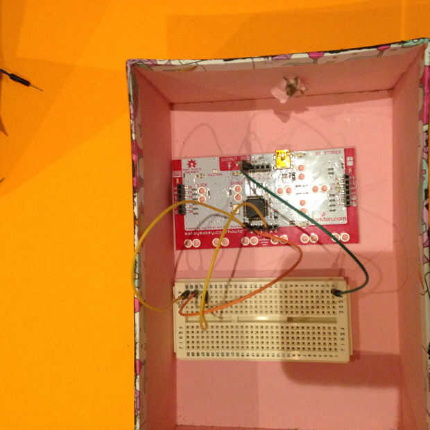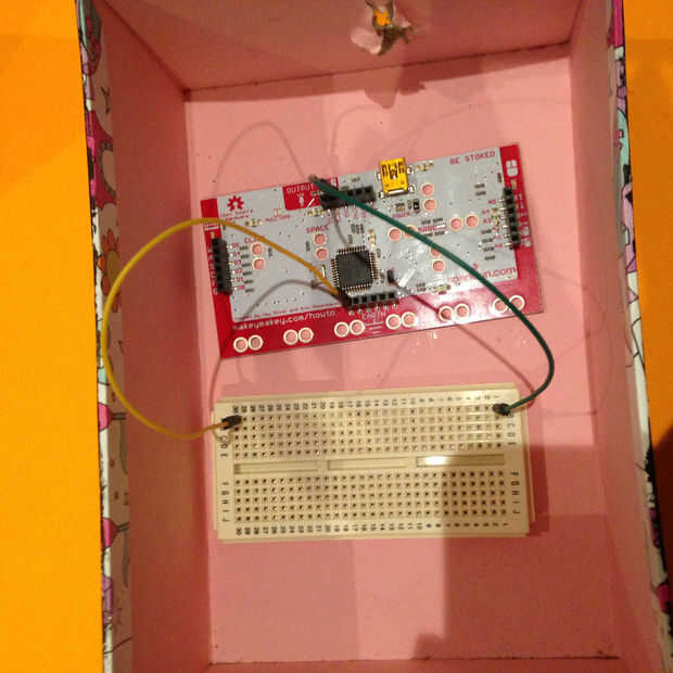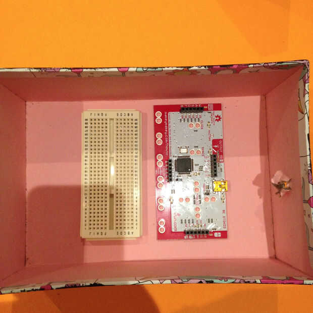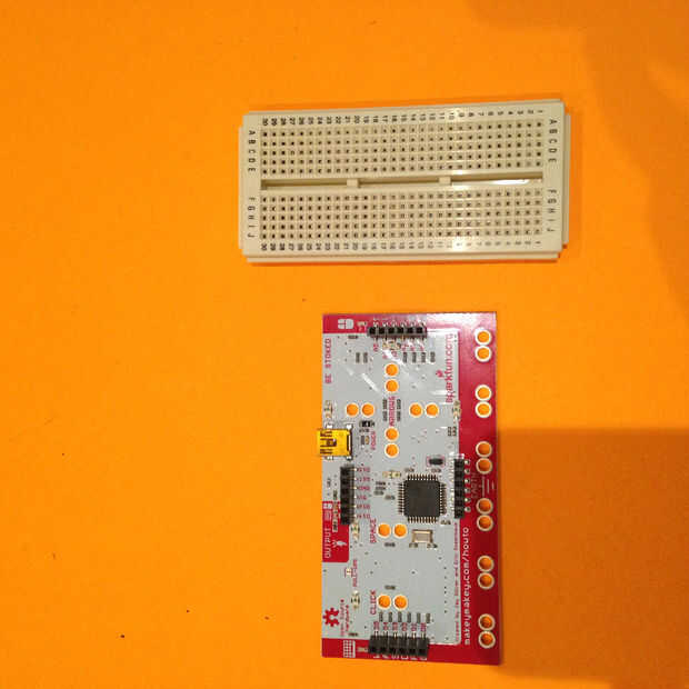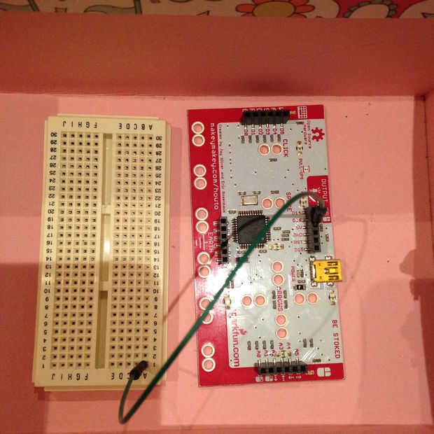 Antes de nada, primero vamos a tomar nuestro MaKey MaKey y protoboard y utilice cinta adhesiva para pegar firmemente hacia abajo en el cuadro inferior.