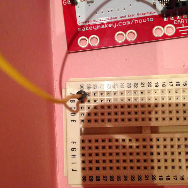 Primero vamos a configurar nuestra conexión protoboard a MaKeyMaKey usando los cables de puente. Tomar un alambre, vamos a colocar en los 5V en la parte superior del tablero MaKey MaKey y en la primera entrada de la Junta de pan. Los cables conectados a esta fila reciben 5V y se utilizará para fuente de energía para nuestro potentiometres.