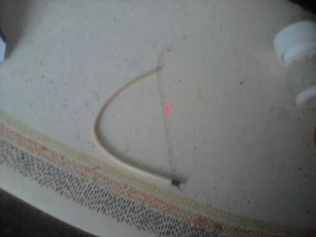 Para hacer este arco utilizó por primera vez un pincho de bambú de cortar por la mitad lateralmente mediante un boxcutter. I había empapado en agua y había atado con cadena y lo dejó allí un par de horas o un día hasta que fue más suave y luego apretar el hilo. Doblado en la forma que se ve en la foto de intro.