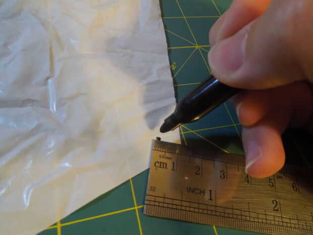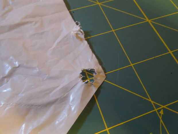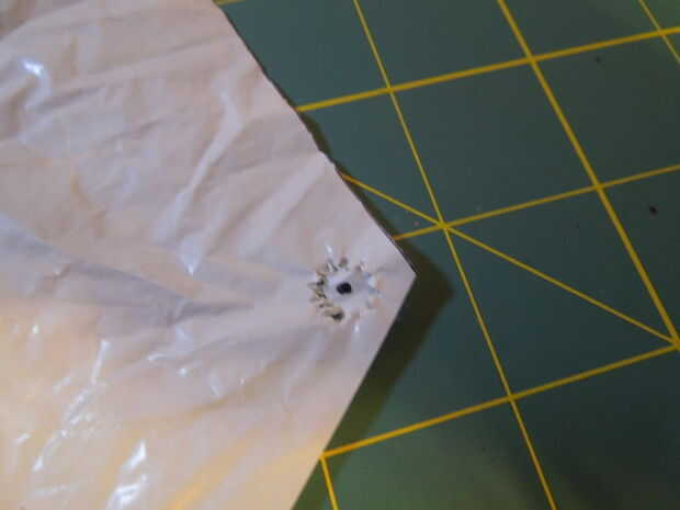 Con un marcador Sharpie, colocar un punto de 1cm de la esquina del paracaídas. Luego la línea del golpe con ese punto y perforarlo a través. Es poco probable que el golpe se corte a través de la plástica completamente (a menos que fueron a calentar la punta hasta derretir el plástico). Si es así, simplemente apriete la pestaña y tire de ella. Repita con las otras esquinas.