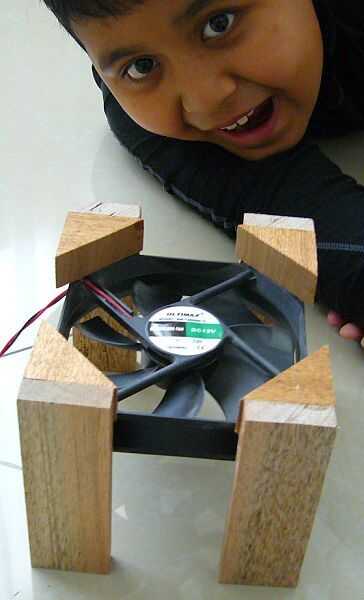 Materiales: 8 piezas de madera, 4 tornillos, un ventilador de computadora, pegamento