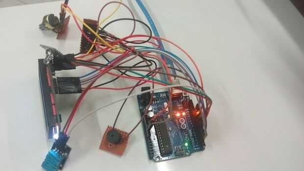 Poner todo el dispositivo necesario como Arduino Uno, la pantalla LCD, el DH11 digital de temperatura y sensor de humedad, así como el zumbador y la RGB led.