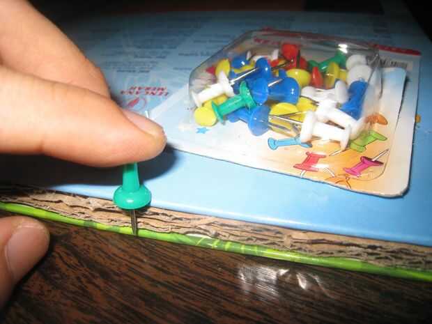Porque este proyecto es para mis hijos de 7 años y a continuación, debo considerar seguridad. Cuando planeo utilizar clavijas de empuje, tengo para asegurarse de que los pernos no se sale de la parte posterior. Luego agrego algunas más cartones para ajustar el espesor deseado. Unirlos con cinta adhesiva transparente alrededor de las fronteras.