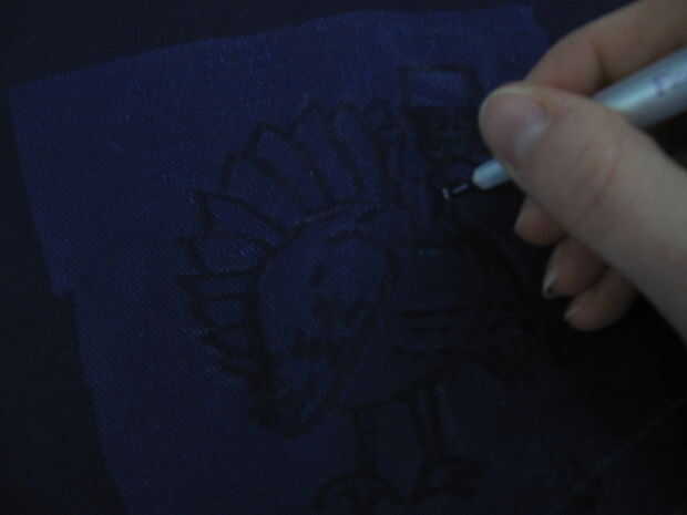Tome un pedazo de tela de tul y un marcador permanente. Poner la malla en la imagen traza con el marcador permanente. Ahora coloque el tul sobre la tela y remontar el marcador con tiza o cualquier herramienta de la marca la tela.
