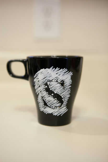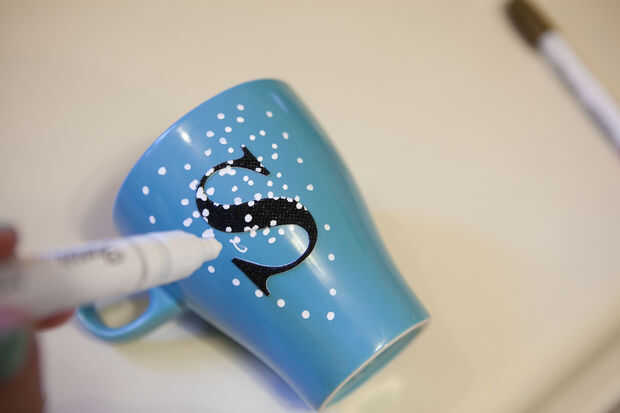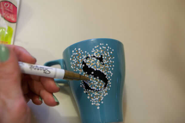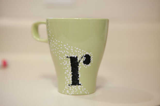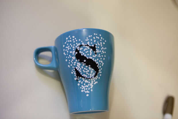 Usé un tapping del marcador en la taza para crear puntos alrededor de la letra en dos y un garabateo movimiento alrededor de él en la tercera. (Me voy a mostrar otras tazas creados así para que veas algunas opciones).