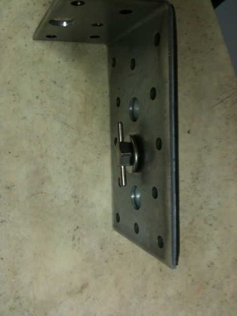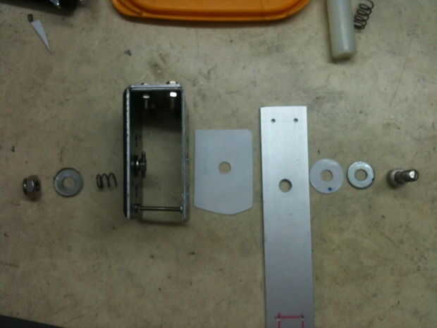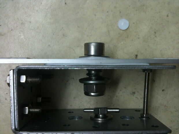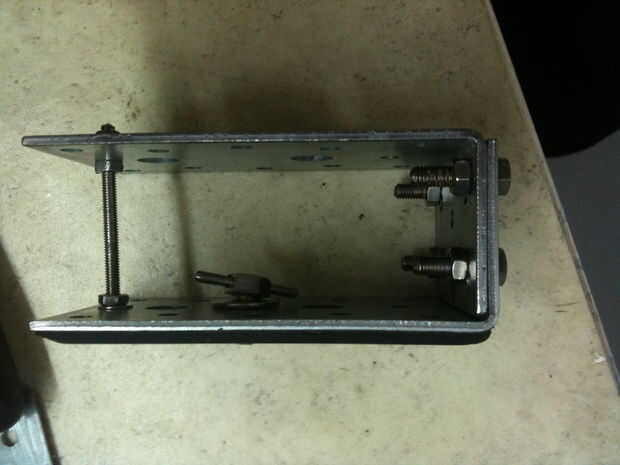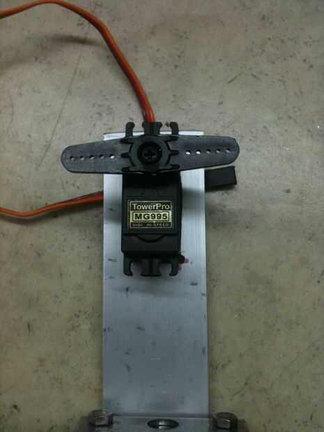 quería que la cámara gire con un servo, así que hice una base para la cámara montar que podía girar sobre un trozo de teflón. Usé 2 soportes de metal para vigas de madera. En la parte superior puse un trozo de goma donde la cámara se ser pernos y un agujero en el centro con un tornillo para que coincida con la cámara. En el extremo abierto puse una varilla roscada para reforzarlo. En la parte inferior coloqué una 10mm allen perno actúa como un punto de giro y la base del servo. El perno tiene un resorte al quitar el bamboleo pero también dejar que gire. En la cabeza del perno até los extremos de la línea para el movimiento. Finalmente el servo atornillado con un brazo de extensión.