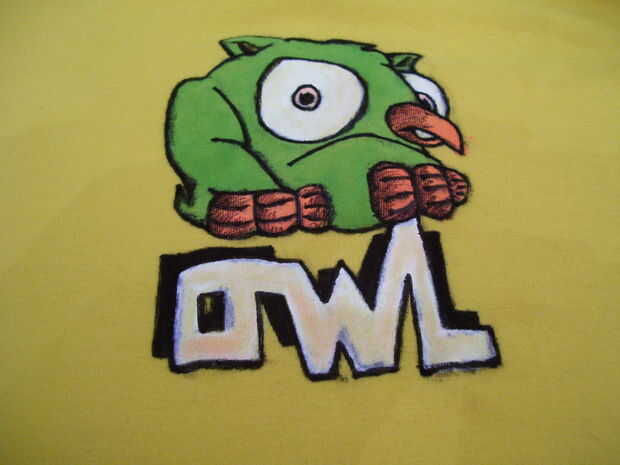 Las dos primeras camisetas en que trabajé eran el logo del búho amarillo y el gris logo "drástico" tomó cerca de dos horas para completar. El rojo tomó un tiempo mucho más corto, pero todos necesitan al menos un día para la pintura se seque completamente. Dejar el cartón insertado entre las capas de la camisa hasta que la pintura esté seca al tacto. Esta manera, ellos no pegan y la pintura no sangra a través.