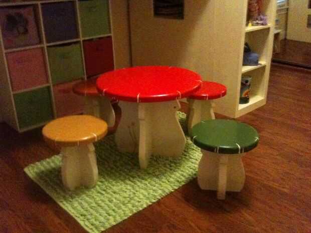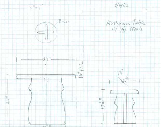un tiempo atrás me divertí oportunidad de construir un niño tamaño set seta y banquetas de sapo para uno de mis clientes.  Había encontrado algo similar en línea pero no era cierto, tipo de cara y todavía tenía que enviarlo.  Esta es mi opinión sobre los taburetes y las mesas disponibles por ahí.  No implica que mi diseño es totalmente original.  Esta es simplemente mi versión.  Pido disculpas ya que he extraviado mi bosquejo original con las dimensiones.