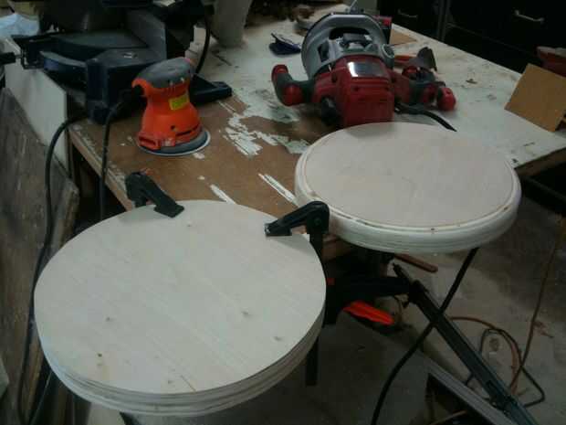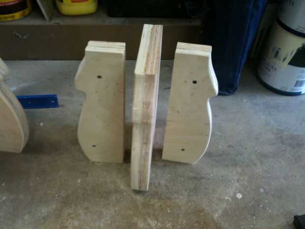 Luego se llevó cuatro de las mitades del taburete y cortar aproximadamente 1.5" de material desde el centro de cada tapa a fondo.  Estos se sujetarse a las piezas enteras para hacer la base de las heces.  Me llevó a cabo una mitad encima de todo un lado y había trazado de líneas en cada lado así que sabía donde debe ir.  Taladré agujeros guía en el centro del espacio.  Luego unta la zona con pegamento y colocar un corte mitad contra él.  Mantuvo estable y me funcionó los tornillos por los agujeros para sujetar las piezas juntos.  Luego usar mi pocket hole jig en la otra pieza cortada y había unida con pegamento y tornillos para el lado opuesto.  Llené todos los agujeros del tornillo nuevo con plaste.  Una vez seco lijarlos ras.  Repita con todas las piezas base restantes.