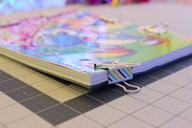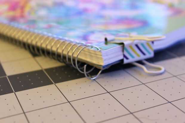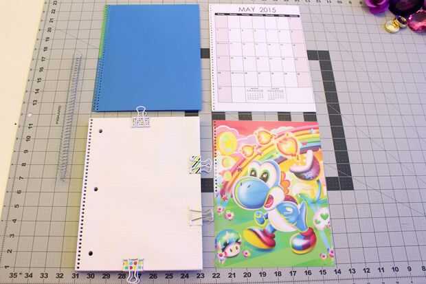 Empecé con la nueva cubierta, cubierta plástica y el calendario ya que estos iban en la parte delantera. Puse estas encima de mi carpeta cuaderno recortada páginas y asegurado por volver a recorte los clips de la carpeta uno a la vez para que todo me alojé juntos. Entonces repetí este proceso para añadir las carpetas posteriores.