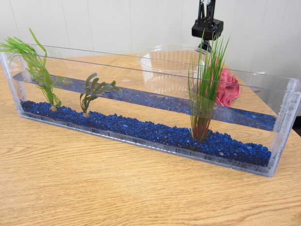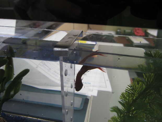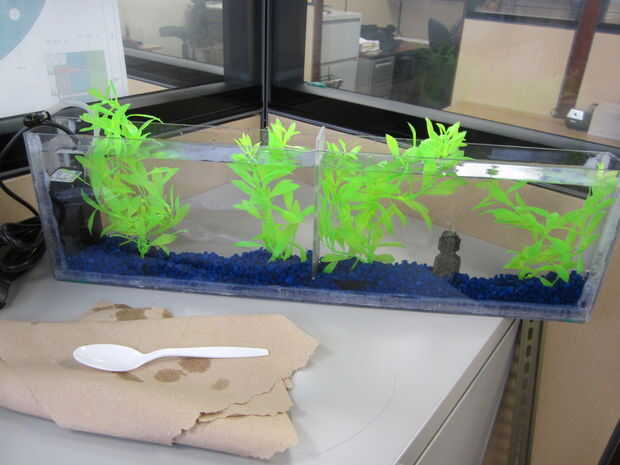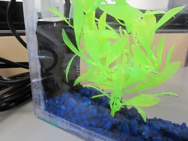 5. encontrar un lugar para agregar el filtro propio, decide pegar en un lado del tanque que hay agujeros en el divisor para la circulación.