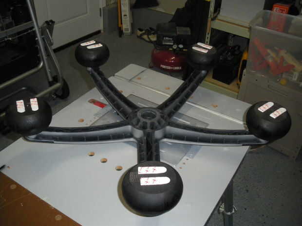 Después de instalar dos tiras de 3M (con sus compañeros) en cada pan, quitar el papel del forro en las tiras de 3M en uno de los bollos. Atentamente centro de uno de los controles deslizantes de muebles sobre el pan preparado y presione abajo firmemente a 3M para el regulador.