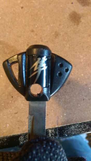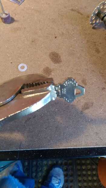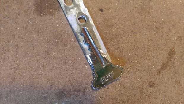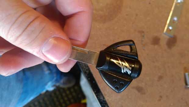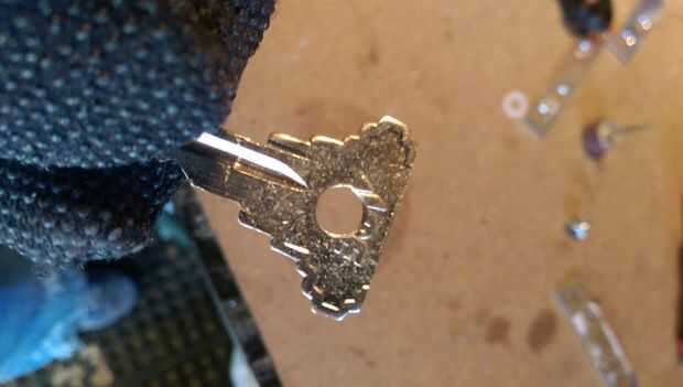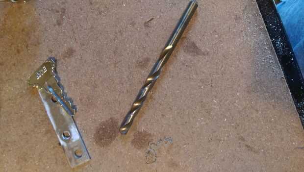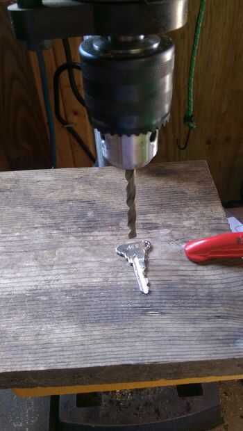 Medida donde termina tu clave en el cuidado de la placa te puede tener que hacerlo para recortar. Con el taladro hacer un agujero cerca del centro como sea posible y perforar. Para mi llave de la casa y la llave de la moto a que cortado algunos de los lados para ayudar adaptarse mejor en mis bolsillos.