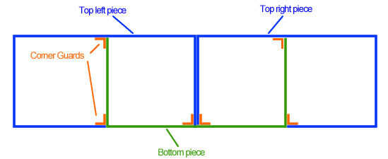 Un protector de la esquina en cada extremo del pegamento y pegar otro protector de la esquina en la parte inferior de la sección horizontal para que el borde sobresalga tiene la cara de cola hacia el centro (ver diagrama más abajo).