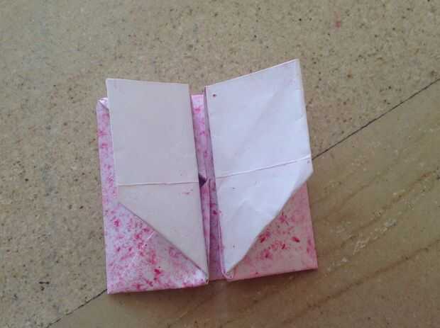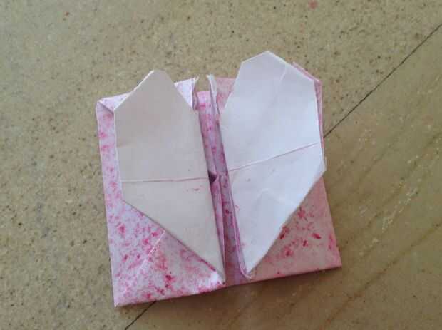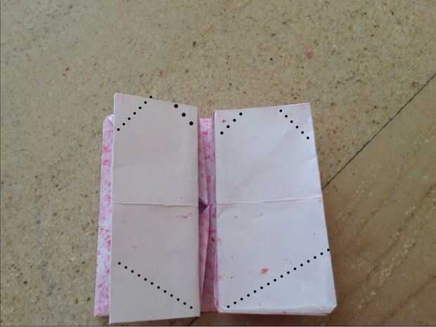 Doblez inferior dos esquinas en hacer la parte inferior del corazón. Arruga bien. Luego, realizar un pequeño pliegue en la parte superior izquierda y superior derecha para crear la parte superior del corazón. Mida desde donde usted sólo dobla aproximadamente 2mm y snip desde allí al centro.