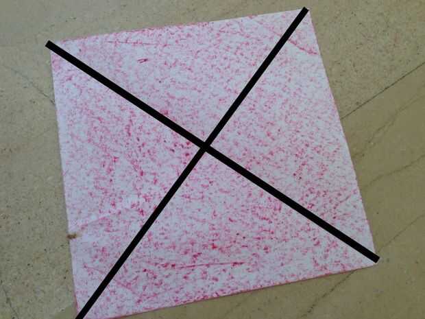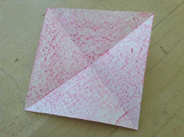 Doble papel cuadrado por la mitad (color o patrón hacia abajo) en el eje diagonal de ambos. Dejar bien y desdoblar.