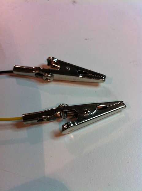 Vamos a obtener los clips de alambre listo ahora. Tomar sus pedazos cortos de alambre y tira unos 1/4" por un lado y 1/2" en el otro. Acople 1/2" de cable pelado a sus clips de cocodrilo. Si los clips tienen tornillos para este propósito, puede utilizarlos. De lo contrario, necesita soldar el cable en los clips o les aplaste, dependiendo del tipo de clips que tienes. Si usted está usando los tornillos, doble el alambre alrededor de los tornillos en sentido horario para que cuando apriete los tornillos, el cable es tirado adentro y apretado, no empujado lejos.