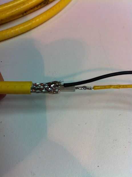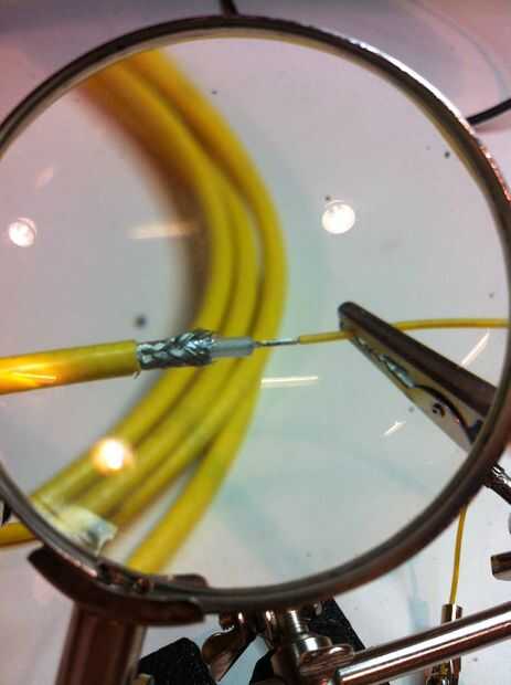 Ahora tenemos que soldar los cables de la pinza en el cable. Alambre para alambre de soldar puede ser más difícil de soldar los componentes en un protoboard, y puede utilizar otras herramientas para ayudar a mantener las cosas en su lugar mientras trabaja en ellos. Utilizar un soporte para 'ayudar a manos' que las abrazaderas de los cables y soldarlos para hacer es más fácil. Comience con el conductor interior del cable. Este es el cable de señal, y el acoplamiento externo es el suelo. Si está usando dos colores diferentes de hilo para los clips, asegúrese de que saber qué color va a que el conductor. Elegí negro para tierra y amarillo para la señal.