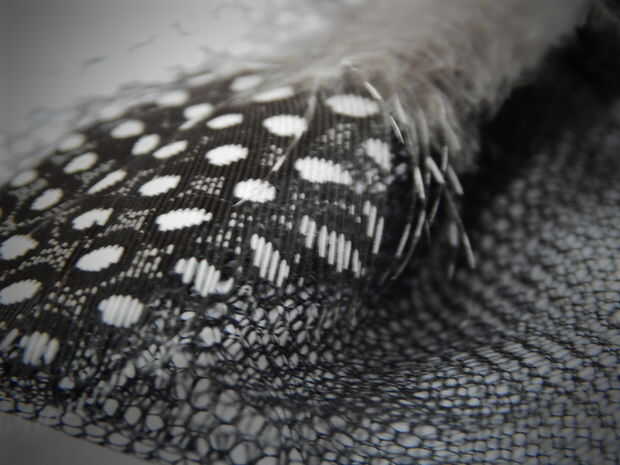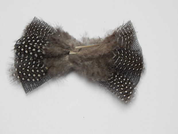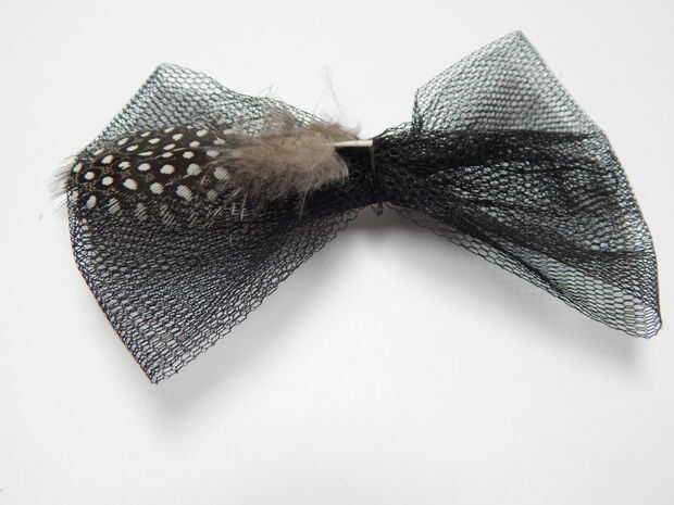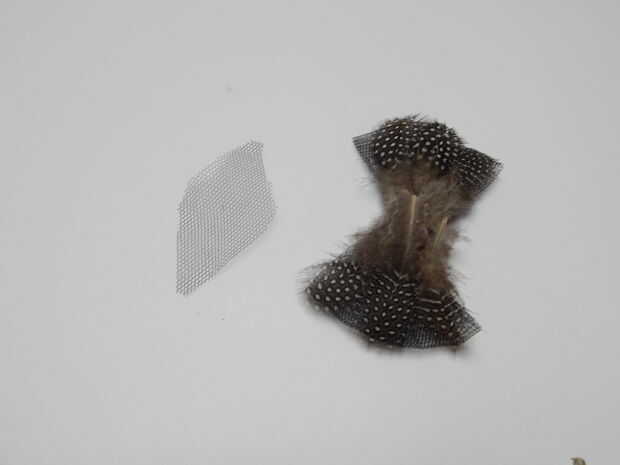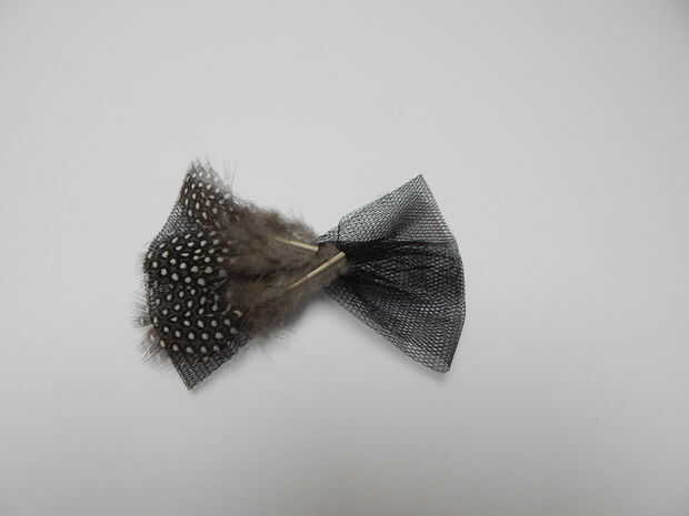 Pegue en la proa la pluma de gallina de guinea, uno después del otro en ambos lados. En la mitad con un pedazo de tul se cubren los extremos de plumas. Luego en la mitad nos pegue 2 estrato de pluma de pavo.