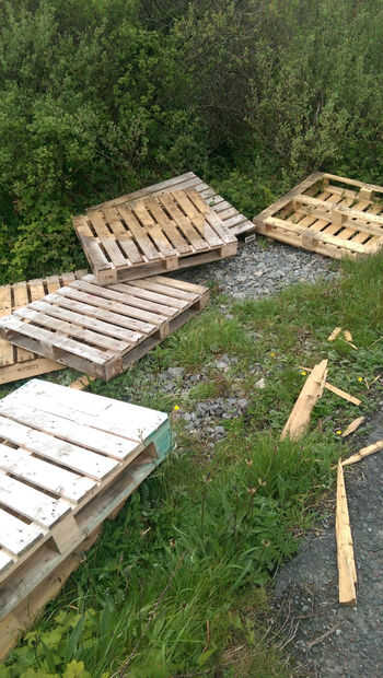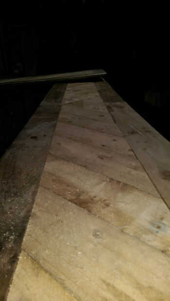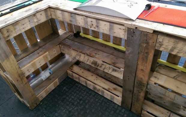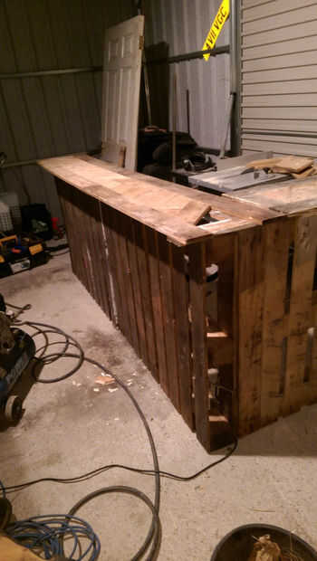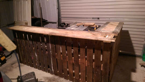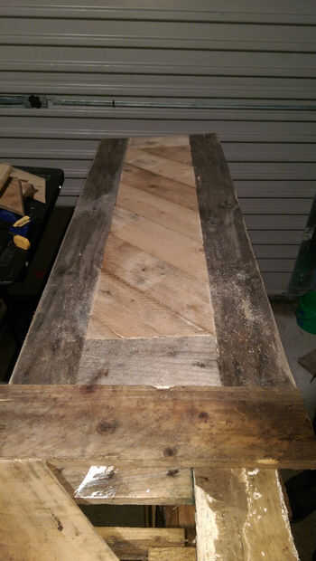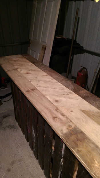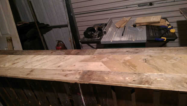 Si esto es algo que gustaría mantener, recomiendo revestimiento en madera conservante como madera de palet que barato no hacer frente a los elementos muy bien. un top liso y satinado arenado funcionaría bien. Personalmente me gusta el personaje que los diferentes tonos de madera cruda le dan así que lo dejé como está.