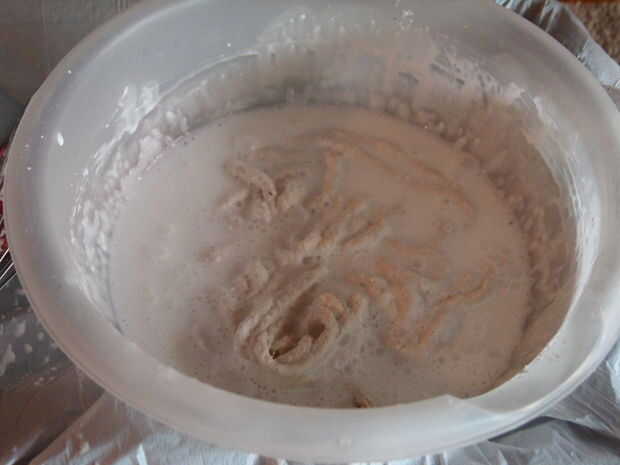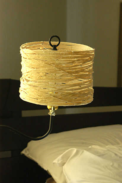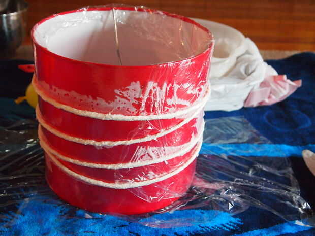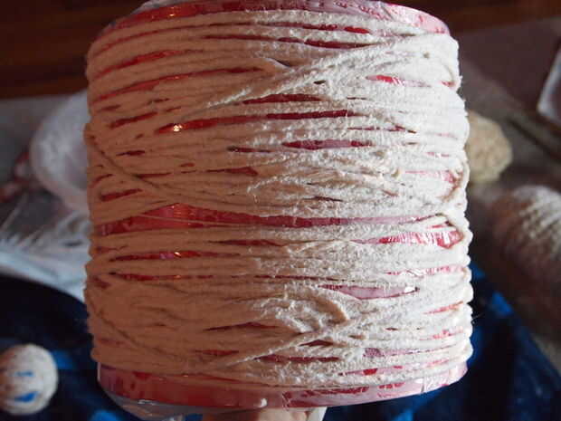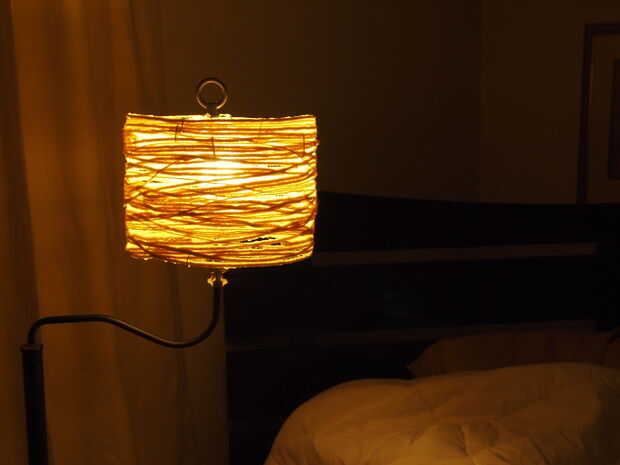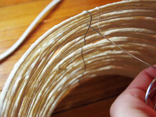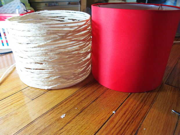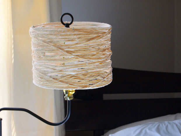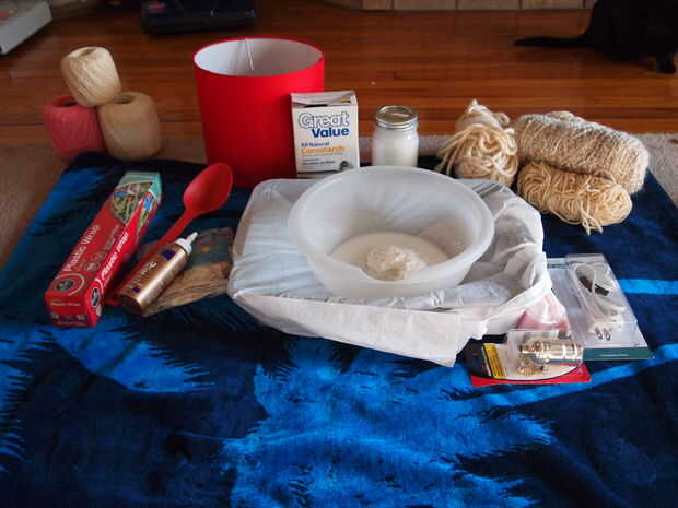 Luego, cortar trozos de hilo de unos 6 pies de largo cada una (no importa si recorto un poco más corto o más largo) - usted puede decidir medida que avanza. Si demasiado, las piezas tienden a nudos de forma. No quiere demasiado corto tampoco. Así que, pongan algunos de esos trozos de hilo en su recipiente y mojar en la mezcla de pegamento. Recoger una pieza y mientras lo hace, utilice la otra mano para ir sobre la pieza para quitar todo exceso o goteo pegamento de él antes de que se envuelva alrededor de la pantalla. Puede envolver alrededor de lo que quieras y cuanto quieras. Intente evitar cualquier agujeros gaping grandes. Si usted tiene gaping agujeros, después de secar completamente te necesitará para asegurarse de que la lámpara es bastante estructurado y necesitar atar pequeños trozos juntos para deshacerse de esos agujeros gaping. Por lo tanto, evitar por no dejar ningún espacio masivo. Una vez que estés contento con cómo se ve y cuántos has envuelto con, será necesario dejarla secar!