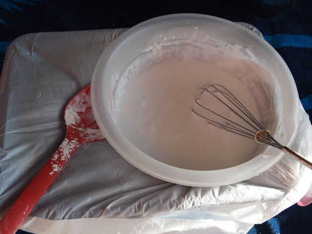 En primer lugar, coloque una toalla en el suelo o en su área de trabajo (o periódicos). Saque la envoltura de plástico y corte un pedazo para envolver alrededor de la pantalla. Una vez totalmente alrededor de él, puedes ir al interior de él para agregar unos trozos de cinta para sujetarla a la pantalla. Una vez que la envoltura plástica esté en la pantalla, estamos listos para empezar a hacer esto!Sacar el recipiente y vierta el pegamento y se mezclan. Después de mezclar, agregar las 2 tazas de agua y continuar mezclando. Si usted tiene el almidón de maíz, ahora usted querrá añadir que en el pasado y usar un batidor para mezclar tan allí no son ningún grumos.