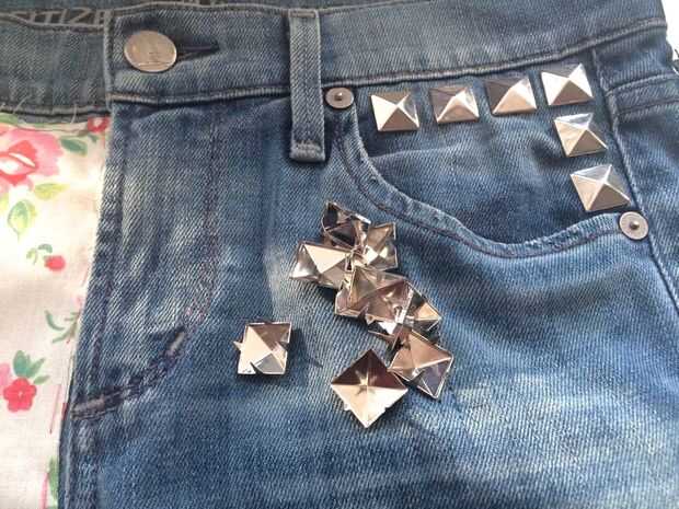 Coloque los postes en los bolsillos al lado de ich en cualquier formación que quieras colocar. Luego empuje los dientes a través de la bolsa, por lo que irá en el interior de los pantalones vaqueros. Ahora fuertemente doble sobre los dientes para asegurarse de que los postes estén fijados sólidamente a los pantalones vaqueros.
