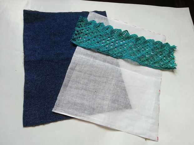 Cortar 1 pieza de tela de jeans y 1 pedazo de tela de la guarnición de tamaño similar, (cualquier tamaño que desee). He utilizado 6 X 5 pulgadas de pantalones vaqueros para hacer la bolsa, donde el ancho de la bolsa sería de 5 pulgadas y la altura de la bolsa sería de 3 pulgadas (después de plegado 6 pulgadas a la mitad).