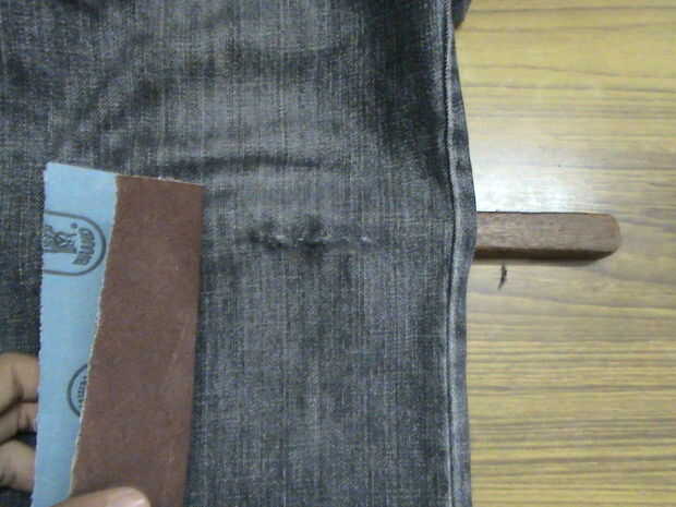 Ahora colocar el taco de madera debajo de los pantalones vaqueros y empezar a raspar los pantalones vaqueros en línea.