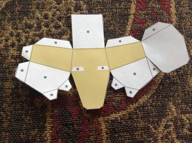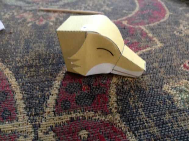 1 ~ la cara: recorte la plantilla para la cara y las orejas. Corte a lo largo de las líneas negras. Luego doblar. Coloque una pequeña cantidad de pegamento en las pestañas blancas y adjuntarlos para formar la forma de la cara.