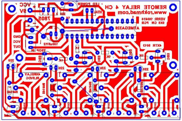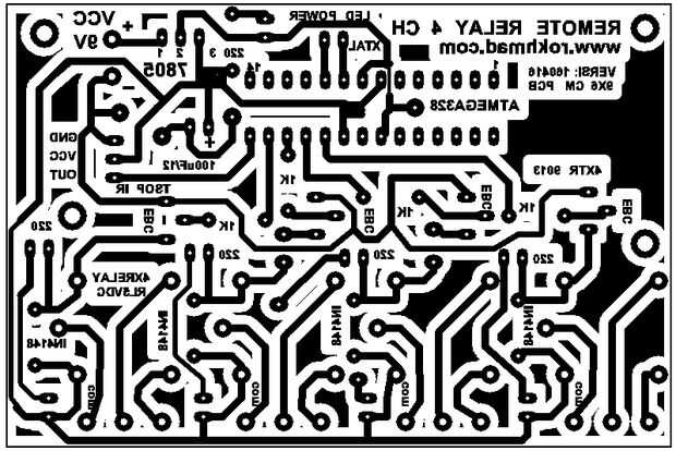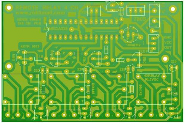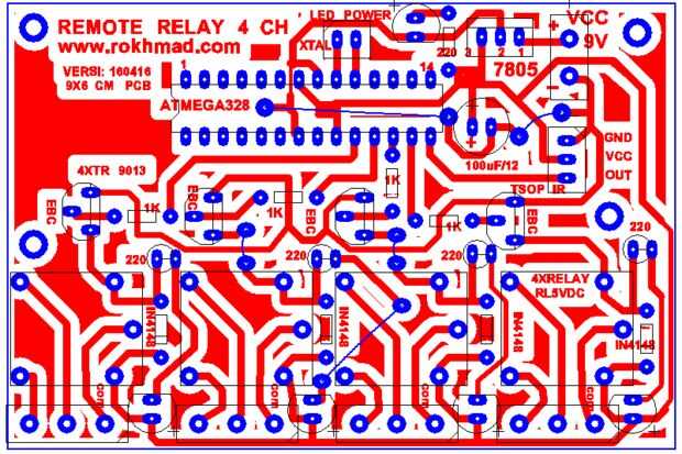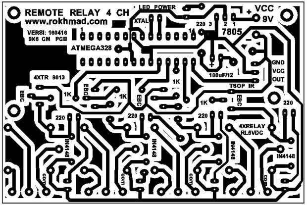 Hacer PCB como la foto de arriba, utiliza transistores NPN para este proyecto como c9013, bc547 etc, R 200 ohm, diodos IN4001, LED 5 mm indicador Rellay, Rellay 5 VDC y recoger su IC atmega 328 de tu placa arduino UNO R3, a este PCB.