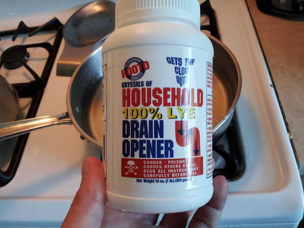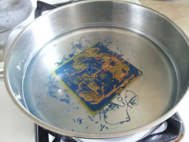 Prepare la solución de extracción. Con su ON guantes, añada suficiente agua a una sartén para cubrir el tablero y luego agregue tres cucharadas de hidróxido de sodio. Lentamente la solución en la estufa de calor, luego coloque la placa interior. Después de unos minutos de hervir, las partes azules se separan de la Junta Directiva. Utilizar pinzas para quitar el tablero y enjuague con agua fría.