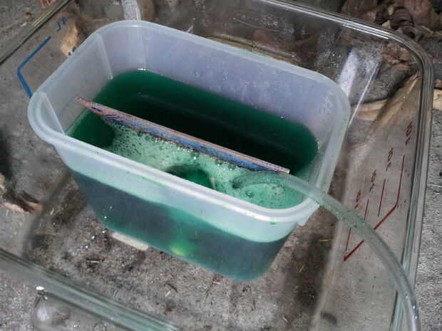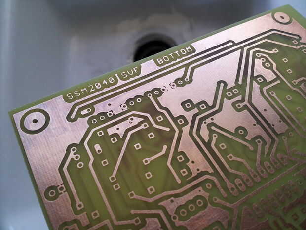 Ahora es tiempo de ponerse los guantes y una parte de ácido clorhídrico se mezclan con peróxido de hidrógeno de dos partes. Siempre agregue el ácido al agua, entonces agregue las dos partes de peróxido de hidrógeno en el recipiente de plástico grabado primero y luego añadir una parte de ácido. Coloque la piedra de aireación dentro de la solución y colocar la placa en la solución. Las burbujas acelerará el proceso de grabado, y puede acelerar el proceso aún más mediante el uso de piedras de aireación más. Las burbujas también ayudan en la adición de oxígeno, lo que ayuda a reponer la solución. Usted tendrá que voltear el tablero durante el grueso del grabado para una mejor cobertura. Cuando se hace, lavar la Junta cuidadosamente con agua. Ahora es un momento óptimo para perforar los agujeros. Yo utilice una broca de tamaño.040 para esta parte.