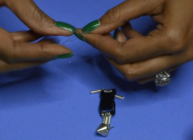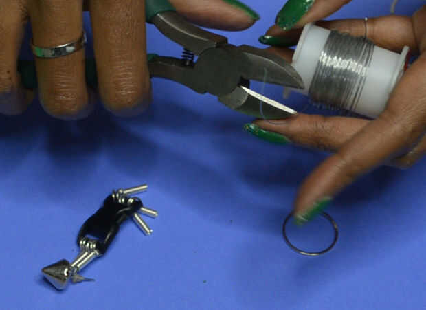 Coloque un anillo de salto a su aro apalancando abrirla con la herramienta de envoltura de cable y deslizando el aro interior. Cerrar el anillo del salto. Corte otro pedazo de cable entre 1 a 2 pulgadas de largo. El cable a través de la secuencia del anillo del salto luego tuerza los extremos del cable juntos. Tomar el alambre torcido que tiene el aro Unido y resbálelo a través del grano de la encrespadura medio en la parte inferior de la pendiente (que es el extremo opuesto donde colocaste el montante pendiente conificado). Tire de la burla del alambre con el alambre de envoltura herramienta y enrolle el cable sobrante en la parte superior del grano prensado medio. Para aclarar, enrolle el cable alrededor del lado del grano prensado que está tocando la hebilla collar de perro. El grano de la encrespadura de derecha e izquierda debe dejarse colgar libre y claro colgar... como cualquier buena pendiente debe:)!