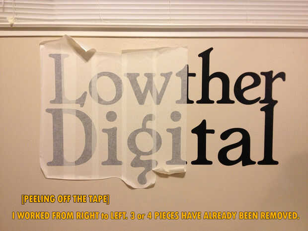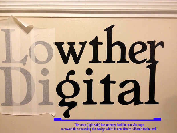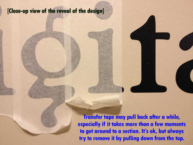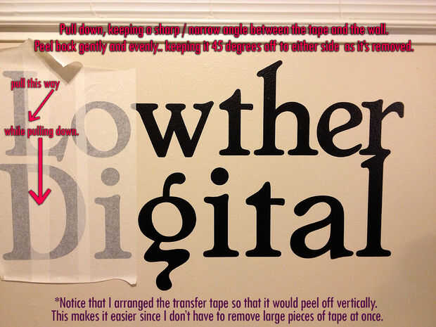 Quitar la cinta de la transferencia tirando hacia abajo y lejos en un ángulo de 45 °. Esto funciona muy bien para la mayoría de los diseños. Si tiene ángulos agudos y estrechos en su diseño no puede tirar hacia esa parte porque levantará para arriba. Tienes que tirar de la cinta de "distancia" de ella. Experience es el único maestro para este paso.