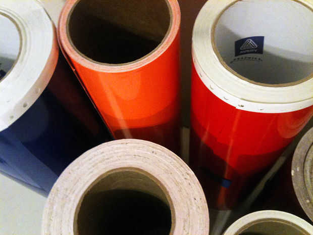 Rotulación vinilo es una delgada hoja de papel o material de PVC con respaldo de plástico enrollado en un tubo de cartón como un rollo de cinta aislante. "Muestra del vinilo" tiene adhesivo en una cara y un bonito acabado en el otro. El vinilo no está enrollado sobre sí misma, pero tiene un papel protector como una etiqueta o sello. La única diferencia es que es una etiqueta de plástico enorme.
