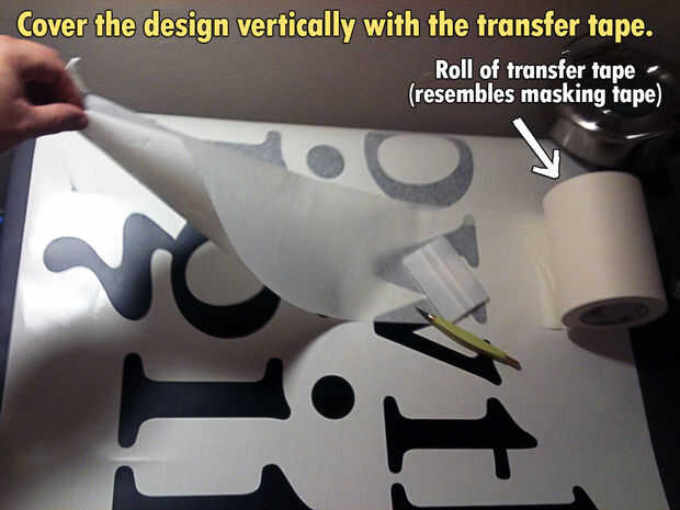 Cubriendo su diseño con esta cinta, podemos entonces Pele el diseño vinilo apagado como si fuera una pegatina gigante y luego aplicarlo a la superficie que queremos — preservando la disposición exacta. Algunos diseños son lo suficientemente simples como para que no necesitan este paso. Mi diseño es de 4 pies de largo por 2 ½ pies de altura. Necesito la cinta para asegurarse de que todo es transferido a la pared y está en el lugar correcto cuando consigue allí.