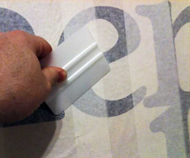 5. una vez que haya aplicado el diseño a la superficie, usted necesita asegurarse de que permanece allí. Usando una escobilla de goma diseñado para ello (puede utilizar una tarjeta de crédito) empuje hacia abajo la cinta y frotar el diseño. Esto ejerce presión sobre el adhesivo y activa el efecto de adhesión completo. Si no haces esto, lo probable es que saldrá cuando retire la cinta.