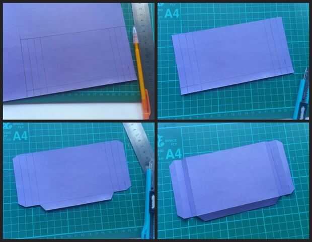 Dibujar un patrón en la cartulina como se muestra en el cuadro 1 de este paso. En esta imagen la gran plaza es el bolsillo y el resto son piezas adicionales para doblar y hacer el bolsillo. Ancho de los cuadrados grandes debe ser igual a la anchura de bloques de texto, pero la altura dependerá de tu elección. Ancho de las piezas extra debe ser 1-2 cm pero no más que eso. Siga las instrucciones de la imagen y cortar el patrón. Hacer pliegues de acordeón en los laterales.
