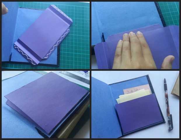 Aplicar el pegamento en las tiras laterales e inferiores. Pegar con cuidado el bolsillo en la parte posterior de la revista, con la tapa dura. Puede mantener unas pequeñas notas en el bolsillo a través de su extremo abierto.