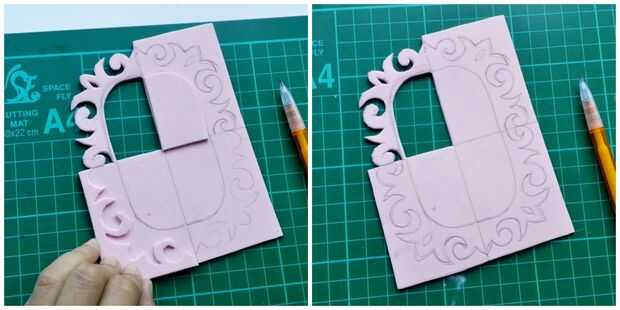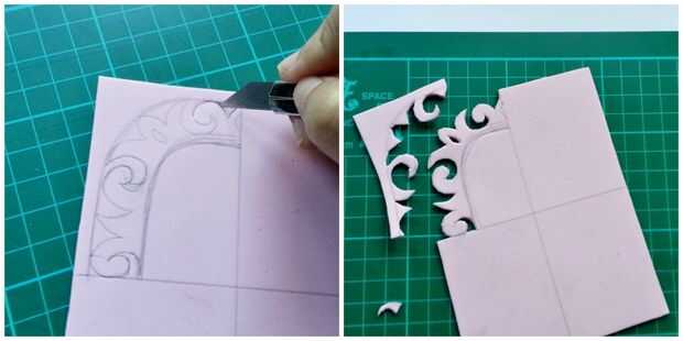 Tome un pedazo de espuma de embarcaciones según su tamaño de libro. Dibuje líneas verticales y horizontales que la espuma se dividen en 4 partes iguales. Dibujar un diseño de frontera en la uno sección. El diseño debe ser fácil de cortar y repetitivo. Después de hacer diseño corte el diseño con un corte. No arruinar o romper las piezas que utilizaremos para el diseño de seguimiento en las 3 secciones. Simplemente gire y trazar el diseño en las otras secciones. Corte cuidadosamente los diseños.