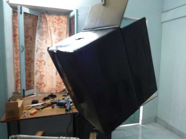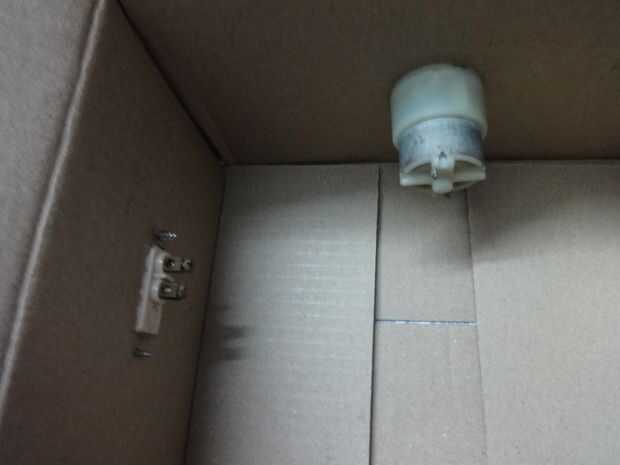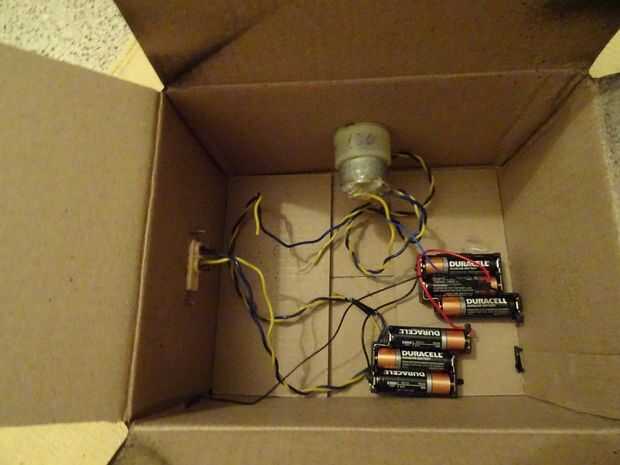 Tomar una vieja caja de cartón, hacer un agujero para el eje del motor, deslice el eje a través de él y del tornillo en el motor. Entonces hacer una ranura para el interruptor y atornillar el interruptor a la caja. Añadir una batería de 9 voltios y cables para arriba. (como se muestra en el diagrama). (Se podría también considerar la caja de pintura).