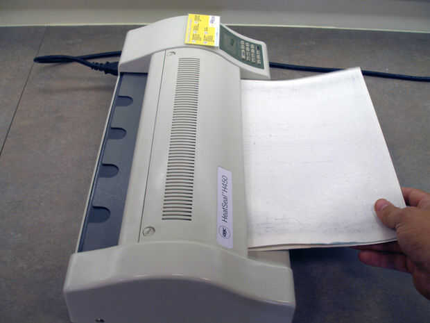 Ahora para laminar. Si no tienes acceso a su super fácil para lo haga en OfficeMax o grapas para que muy barato. Asegúrese de que utiliza un laminado de calor porque un sello frío sólo no se verá tan bien.