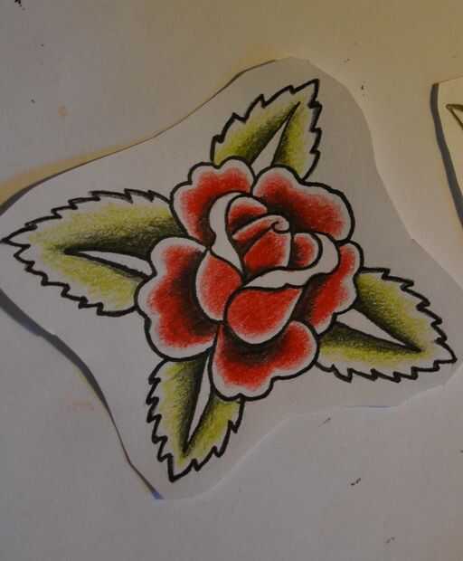 Rosa: son realmente fáciles de dibujar. Dibujar una rosa de simplificar y colorearlo: antes con rojo brillante (dejar algunos espacios en blanco en los bordes de los pétalos), luego mezcla con el negro para el sombreado (mirar la foto), lo mismo para las hojas con verde y negro.